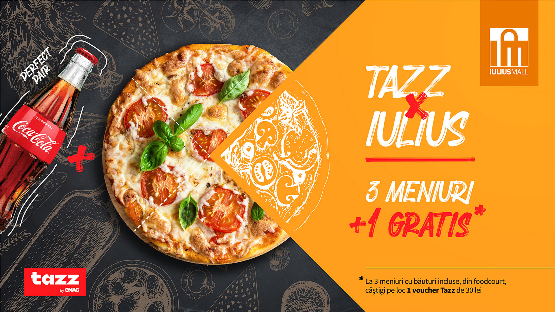 Se spune că ești ceea ce mănânci, de aceea restaurantele prezente în foodcourt-ul Iulius Mall îți propun doar specialități! Vino să te delectezi cu preparatele tale favorite, iar noi te premiem! Până pe 5 septembrie 2021, Iulius Mall Cluj împreună cu Tazz by Emag ți-au pregătit o super campanie: la trei mese servite primești un voucher în valoare de 30 de lei, valabil în aplicația Tazz. De fiecare dată când cumperi preparate de minimum 25 de lei la unul dintre restaurantele din foodcourt și o răcoritoare din gama Coca-Cola, păstrează bonul și ștampilează-ți cardul la Centrul de Premiere. La trei ștampile, returnezi cardul și primești pe loc voucher-ul Tazz, în valoare de 30 de lei.